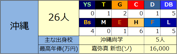 もうひとつの10位は沖縄県です。最高年俸の嘉弥真 新也投手(ソフトバンク/石垣市/八重山農林高)をはじめ、山川 穂高選手(西武/那覇市/中部商)、平良 海馬(西武/石垣市/八重山商工)と3人の1億円プレーヤーを輩出しています。