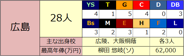 | 9位 | 広島 | 28人 | 広陵(3) 大阪桐蔭(3) | 柳田 悠岐(ソ) | 62,000 |