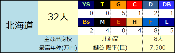 | 8位 | 北海道 | 32人 | 北海高(8) | 鍵谷 陽平(巨) | 7,500 |