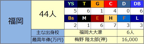 | 順位 | 都道府県 | 選手数 | 主な出身校 (人数) | 最高年俸選手 | 金額(万円) |