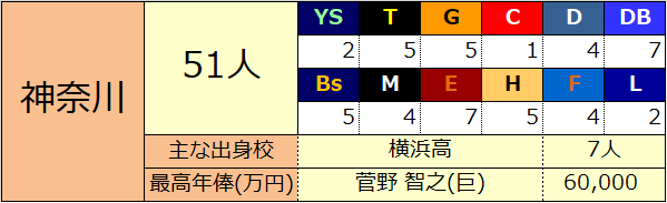 | 4位 | 神奈川 | 51人 | 横浜高(7) | 丸 佳浩(巨) | 45,000 |