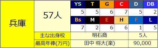 | 2位 | 兵庫 | 57人 | 明石商(5) | 田中 将大(楽) | 90,000 |