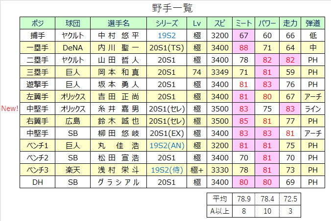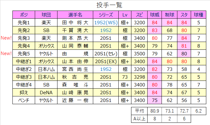 先日アニバーサリー選抜総選挙の投票がありましたが、こちらでも何人かほしい選手が選ばれておりました。キャッチャーの強化を図れる西武)森選手、19年度版から継承できるソフトバンク)千賀投手、日本ハム)宮西投手、楽天)浅村選手、巨人)丸選手、DeNA)宮崎選手、ヤクルト)村上選手あたりが狙い目になってくると思います。今から10月のアニバが楽しみです!