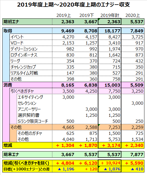 2019年度年間では引くべきガチャを除いて+10924エナジーと、目標の月1000エナジー=1年で12000エナジーの増加には1076エナジー届かなかったという結果になりました。年間トータルでは3174エナジーの増加となっていますが、セレクション4250エナジー分を使用しなかった(できなかった)ので当然と言えます。