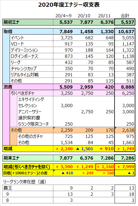自分は引くべきガチャを除いて月1000エナジーの増加を想定しているので、その目標を160エナジー上回ったということになります。これで2か月連続で想定を上回り、上期のマイナスをほぼカバーできた計算になります。